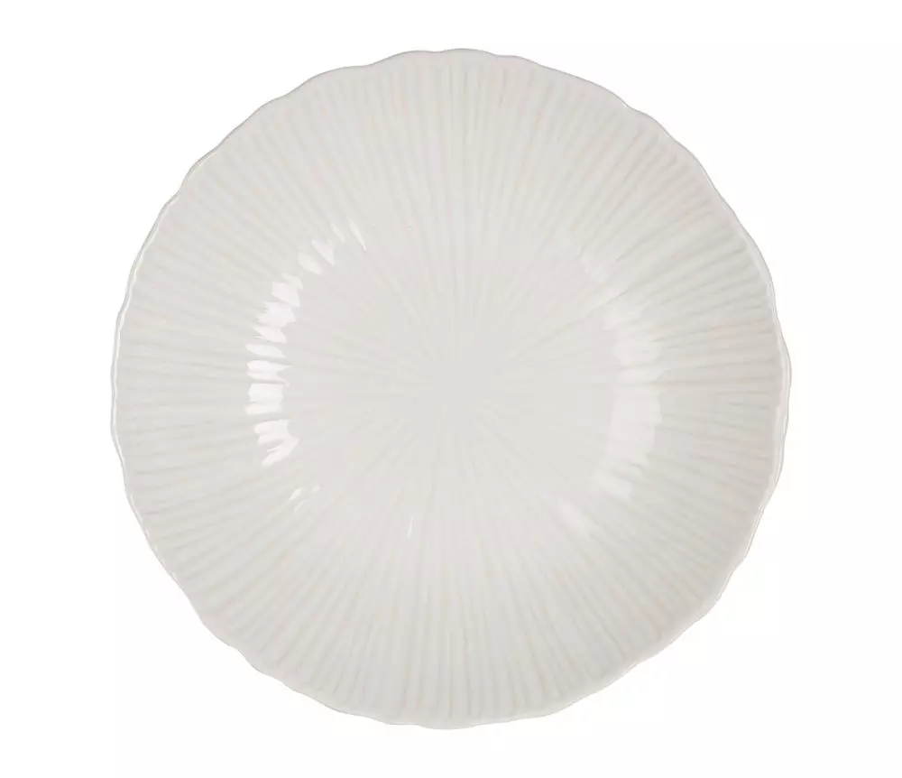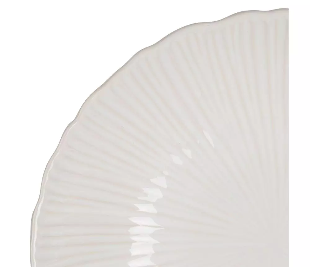 Rundt serveringsfat med høy kant i hvit glasert keramikk.