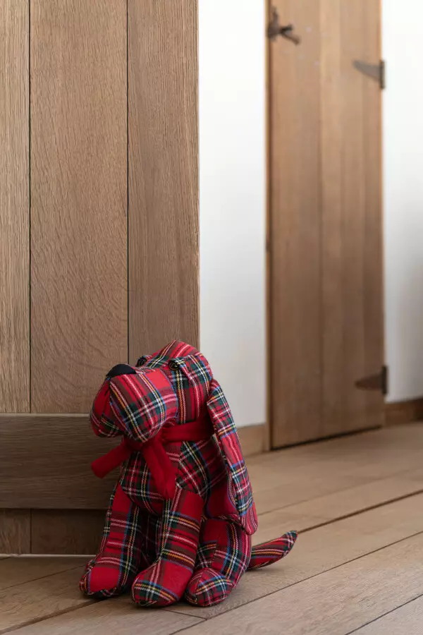 Dørstopper eller dekorativ hund i et nydelig tart-mønster.