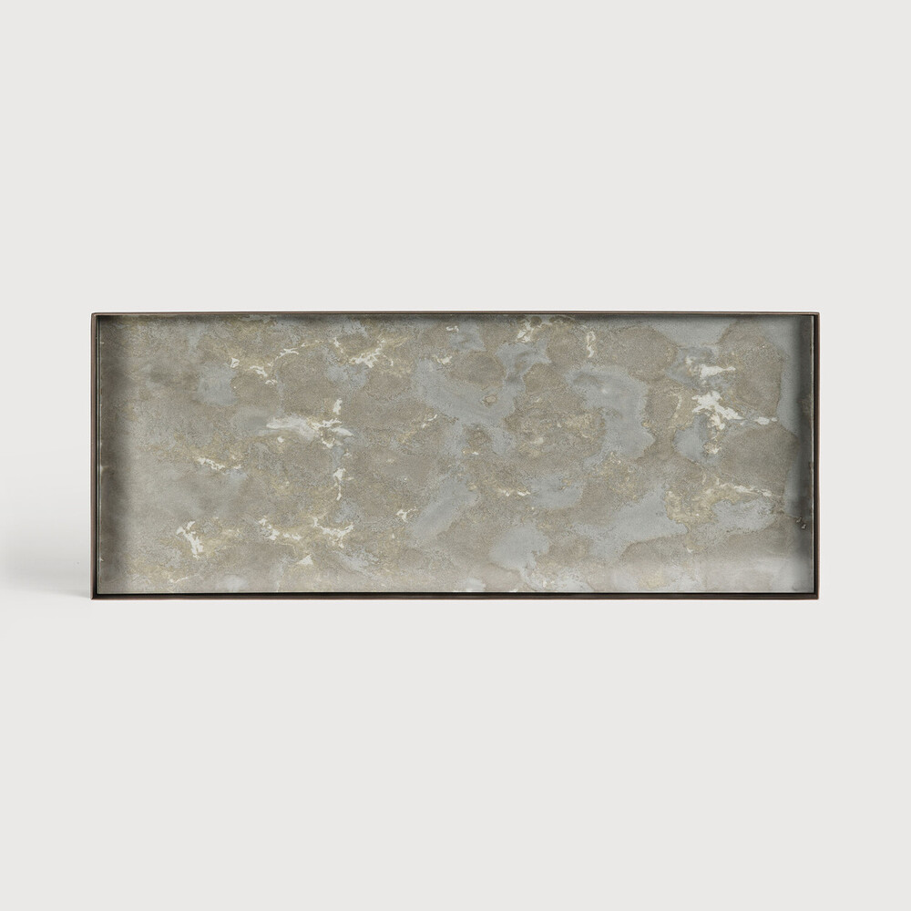 Rektangulært dekorbrett med høy metallkant og håndmalt speilglass i vakker sølv- og gullfarge.