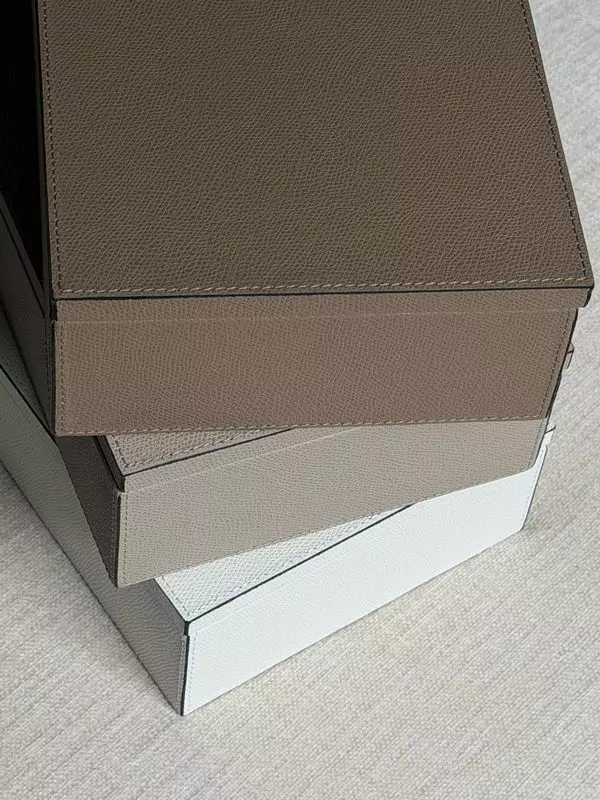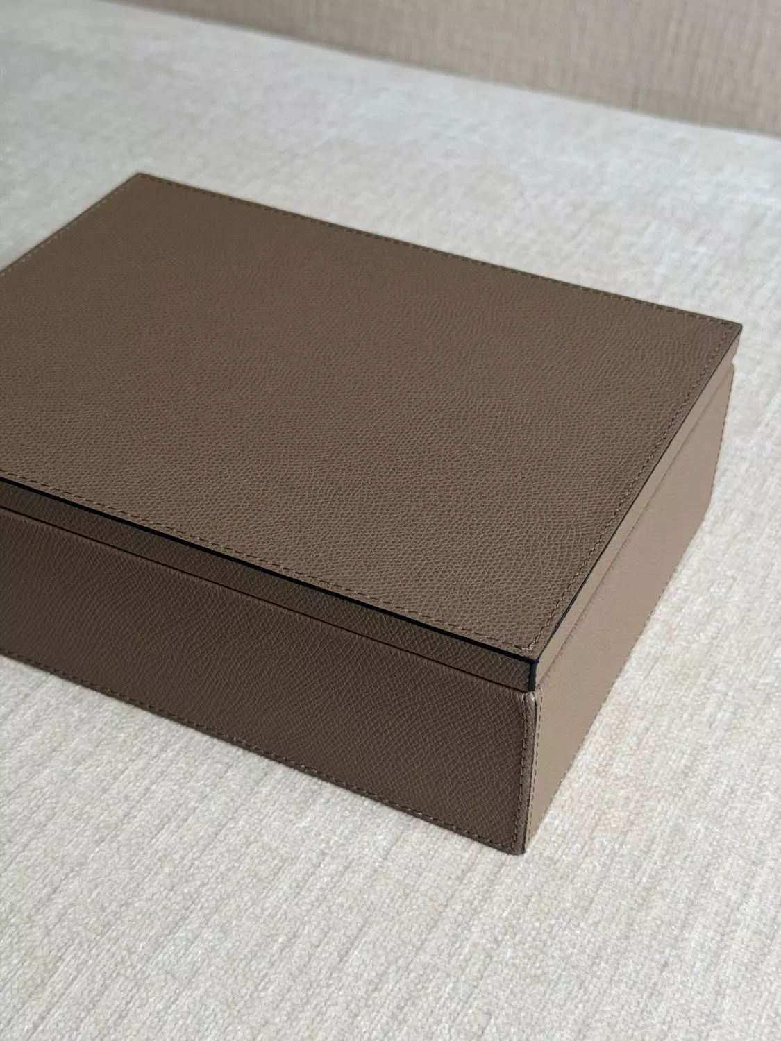 Boks med lokk fra Giobagnara . Boksen er laget av tre, trukket med kalveskinn og håndsydd med matchende tråd.