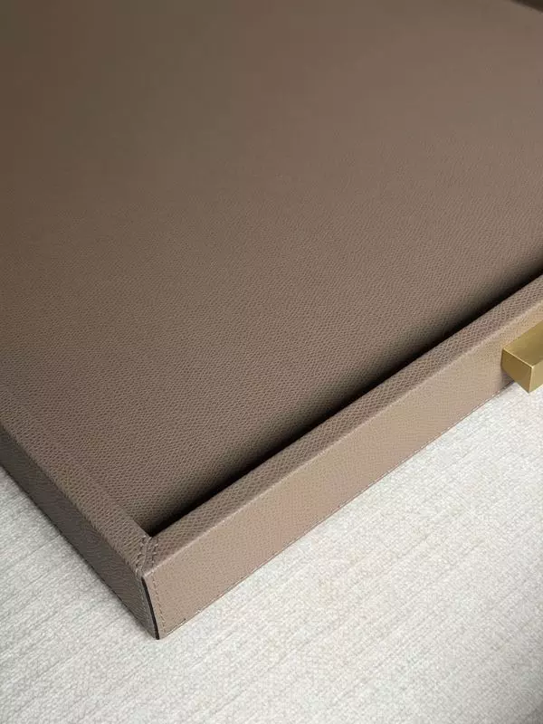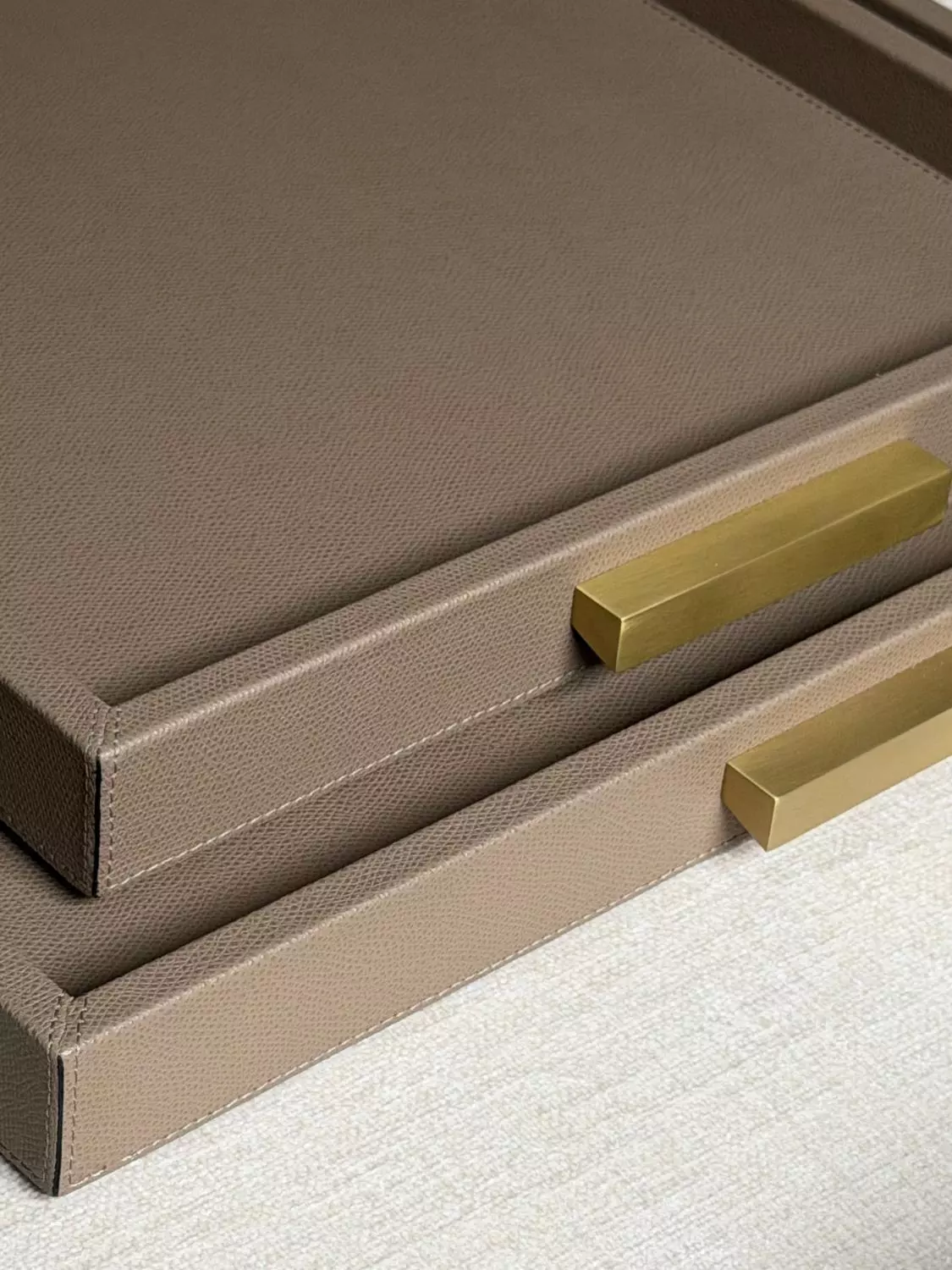 Brettet er laget av tre, trukket med kalveskinn og håndsydd med matchende tråd. Sorte metallhåndtak på hver side.
