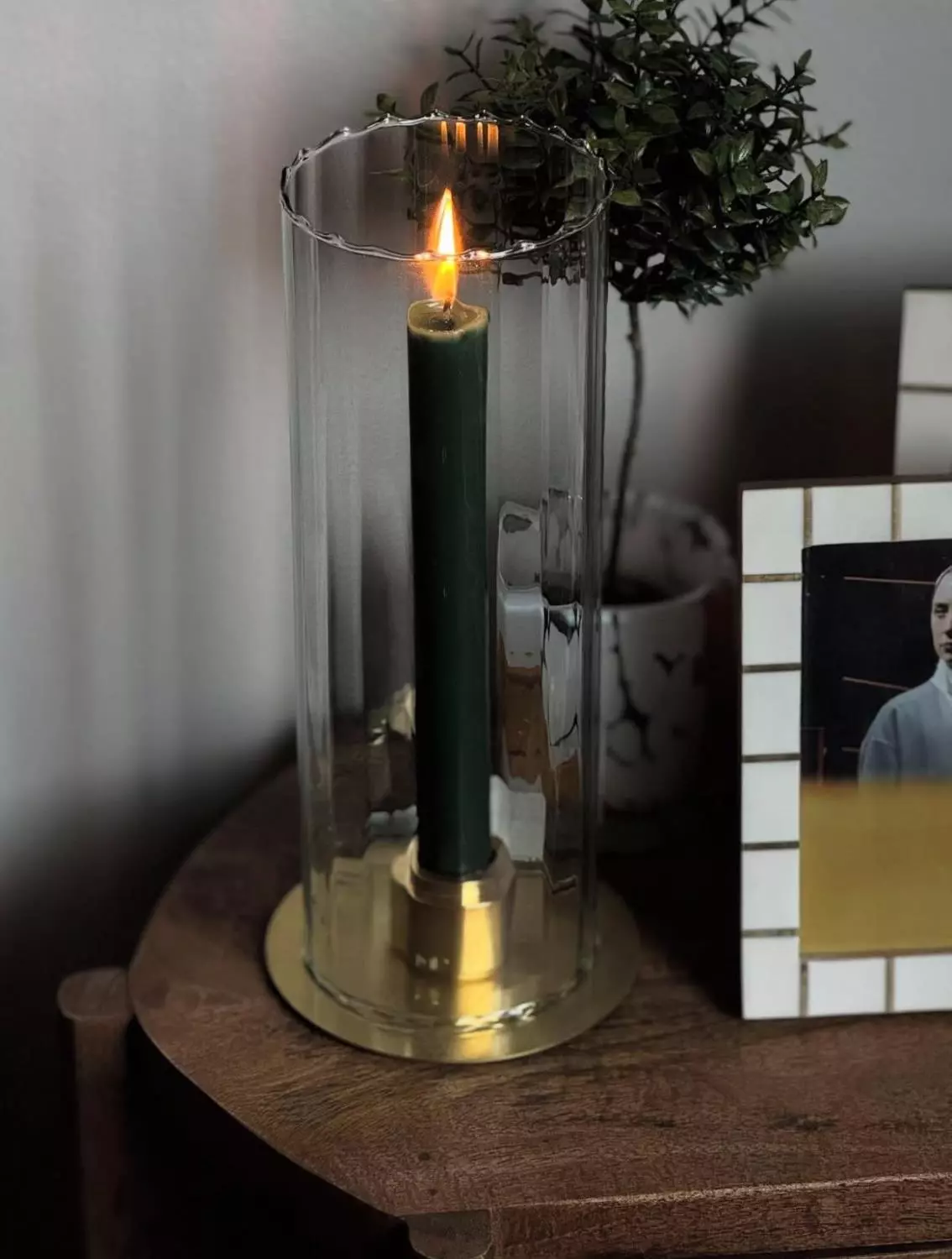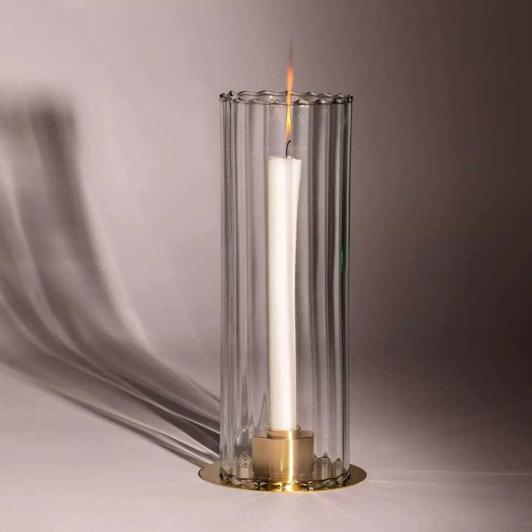 Denne elegante lyslykten i bølget, resirkulert glass passer perfekt sammen med FOLIES 1920 lysestake i messing fra Maison Pechavy.