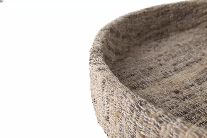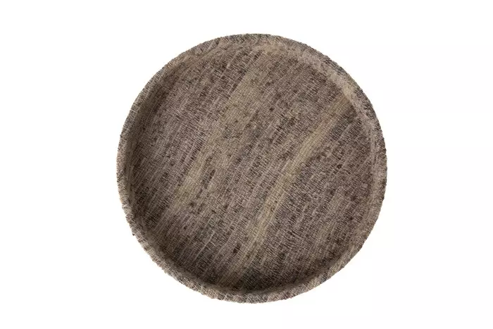 Rundt dekorbrett i tekstil.