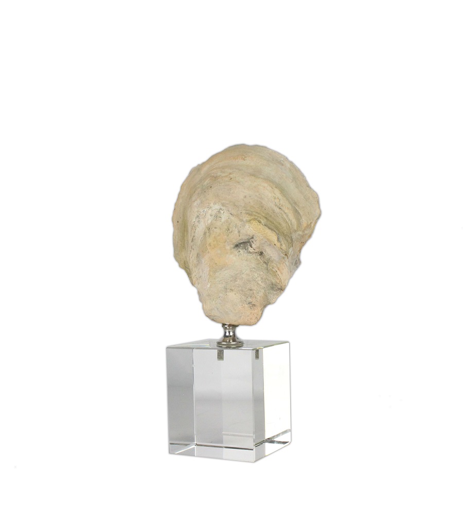Dekorativ skulptur i hvit farge med skjellmotiv og en firkantet glassbase.