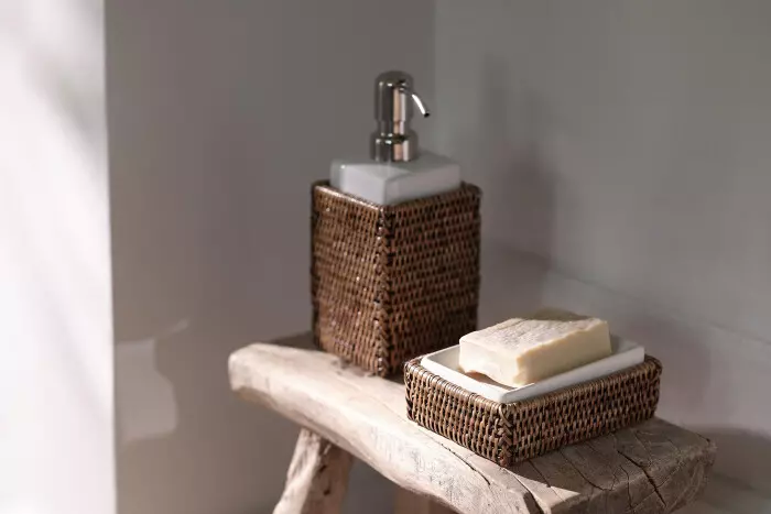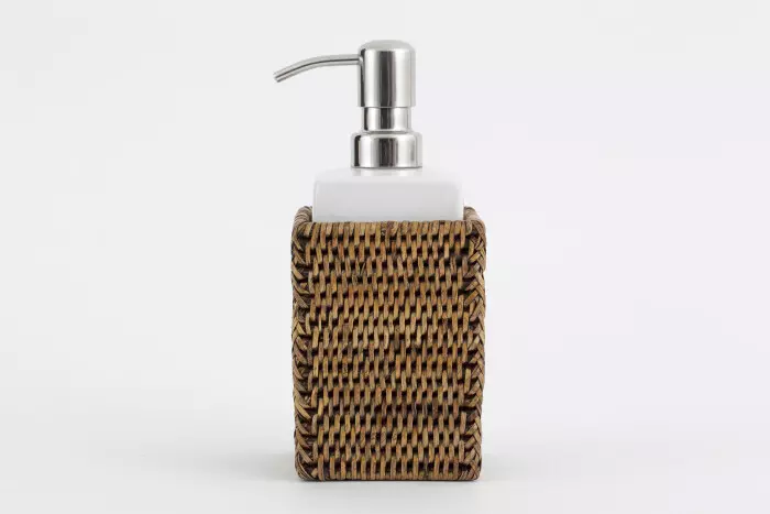 Såpedispenser i glasert keramikk med pumpe i rustfritt stål og rotting på utsiden.