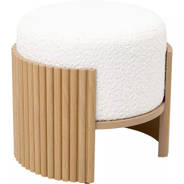 Rund puff i lyst tekstil med detaljer i natur.