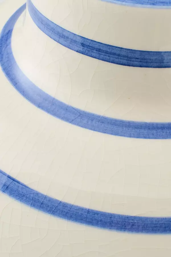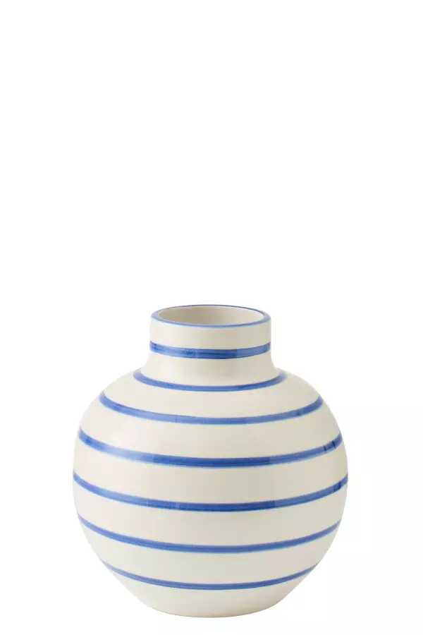 Rund, hvit vase med blå striper.
